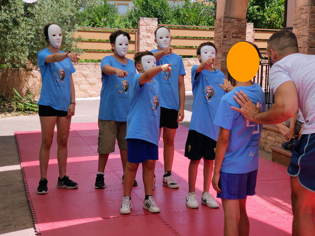 Además del teatro de máscaras, también trabajamos una dinámica centrada en la conciencia del espacio personal. Reflexionamos sobre cómo ocupo mi espacio: si lo hago desde una actitud pasiva, agresiva o asertiva; a quién dejo entrar en él y a quién no; cómo protegerlo y cómo establecer un límite claro y visible de manera física. Esta actividad conecta de forma directa con lo que se trabaja en autodefensa, pues en la metodología de AEPAE las diferentes áreas se retroalimentan mutuamente, reforzando los aprendizajes desde distintos lenguajes y perspectivas.